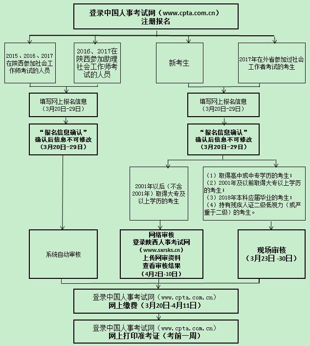 所有报考人员均要进行网上注册报名和缴费,并按要求进行现场或网络资格审核。报名工作分别在中国人事考试网和陕西人事考试网上进行。中国人事考试网是报名缴费平台(所有报考人员注册报名、缴费),陕西人事考试网是网络审核平台(符合网络资格审核条件的报考人员上传资格审核材料)。