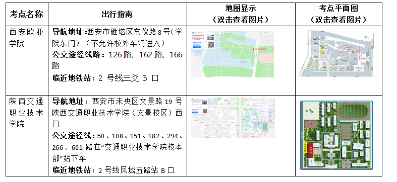 建议应试人员在考试前一天实地察看考点考场,熟悉考点示意图、周边环境、乘车路线及指示标识。考试当天根据自身实际合理选择交通方式,安排足够的出行时间,避免参加考试时走错考点、进错考场,避免延误考试。各考点导航地址及交通路线指示详见附件内容。