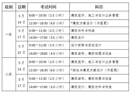 2026年度一级注册建筑师资格考试于5月16日、17日、23日举行,二级注册建筑师资格考试于5月16日、17日举行。具体科目考试时间安排见附件1。