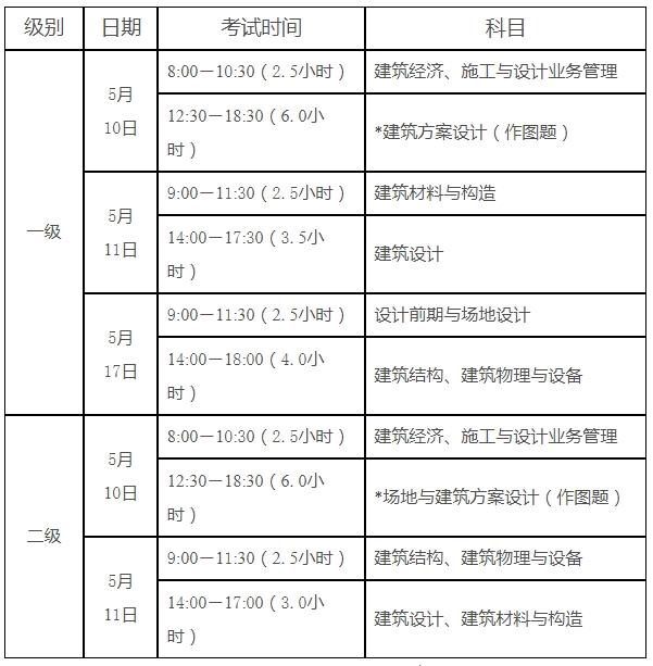 2025年度一级注册建筑师资格考试于5月10日、11日、17日举行,二级注册建筑师资格考试于5月10日、11日举行。具体科目考试时间安排见附件1。